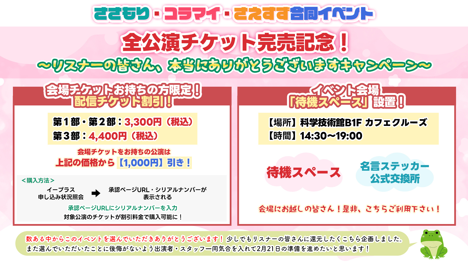 【イベント情報】2月21日(土)ささもり・コラマイ・さえすず合同イベントチケット完売キャンペーン実施!