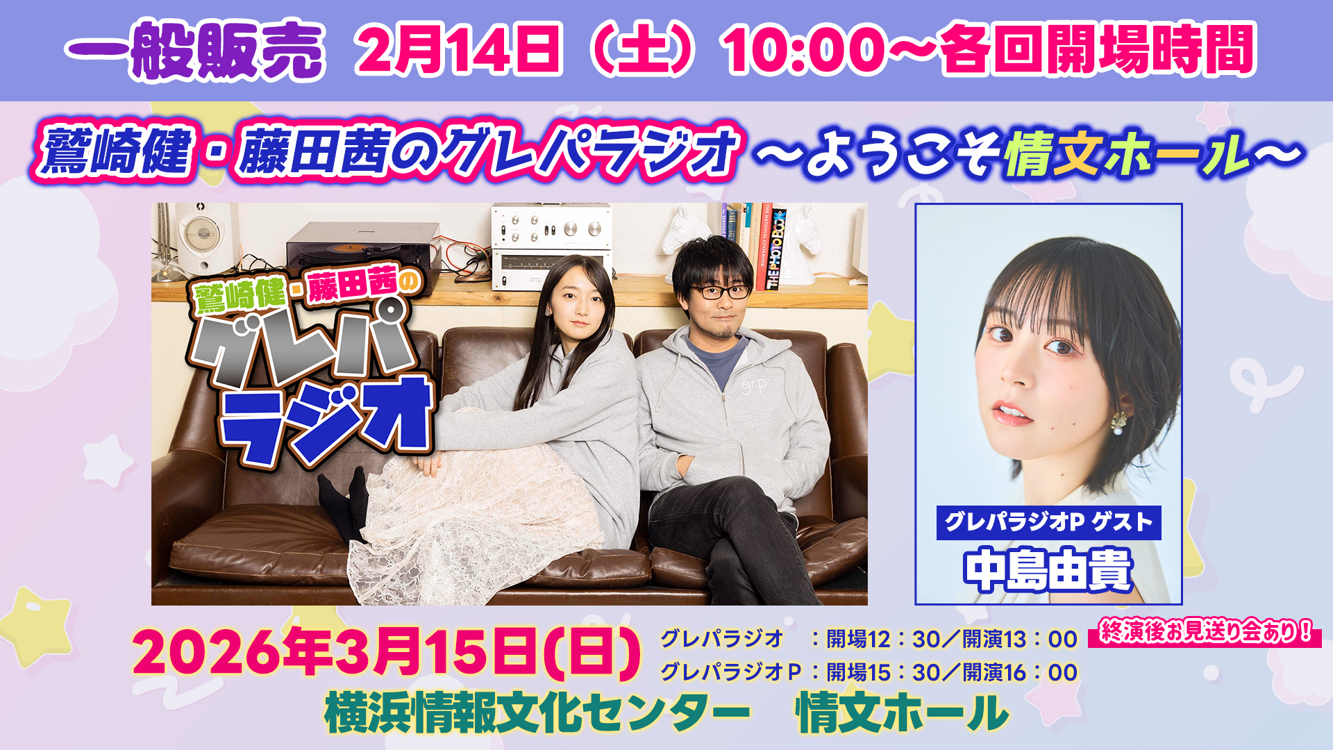 2026年3月15日(日)開催する「鷲崎健・藤田茜のグレパラジオ」番組イベントのチケット一般販売は2月14日(土)午前10時から発売開始!