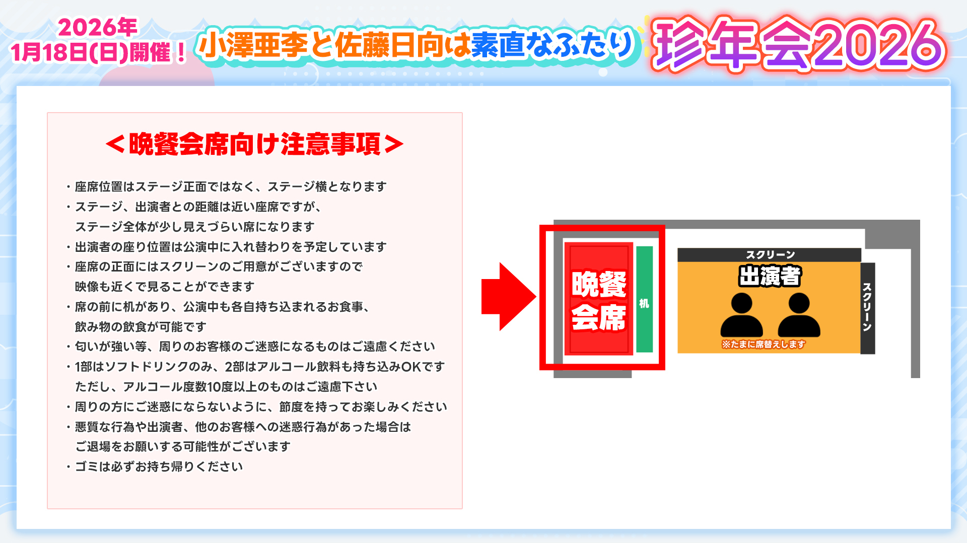 ※ 晩餐会席は、ステージ・出演者との距離は近い座席ですがステージ全体が少し見えづらい席になります。